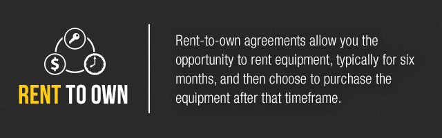 Rent-to-own and lease options. Rent-to-own agreements allow you the opportunity to rent equipment, typically for six months, and then choose to purchase the equipment after that timeframe. You can often use your completed rental payments as a down payment. Leasing options assist in longer-term projects, extending over a year, and can include a purchase or renewal option at the end of the agreement.